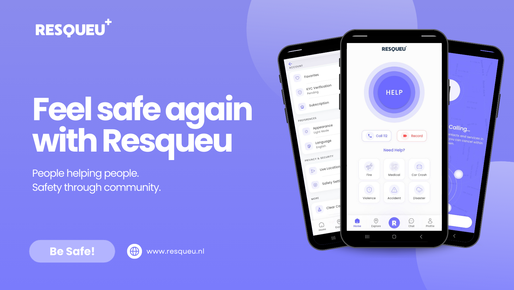 Veel mensen voelen zich niet altijd veilig. Resqueu zorgt ervoor dat je nooit meer alleen bent op een belangrijk moment. De app werkt overal in Nederland en is gemaakt voor gezinnen, ouderen, jongeren en alleenstaanden.